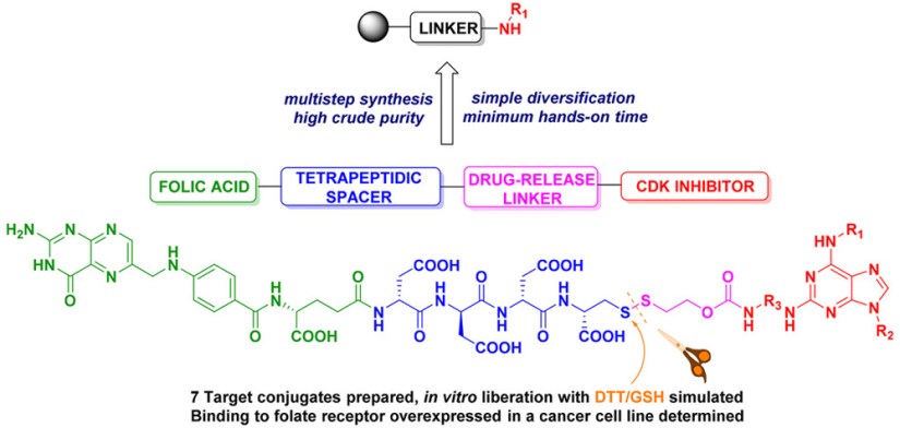 The solid-phase synthesis was also used for the preparation of folic acid conjugates, although in this case without using the concept of preloaded resin (J. Org. Chem. 2017, 82, 13530). Little or no specificity to cancer cells is one of the most serious problems of traditional chemotherapy for cancer as it leads to systemic toxicity. The systemic toxicity of conventional chemotherapy causes serious side effects and is also one of the limiting factors of treatment efficiency. The use of small molecule delivery systems is a promising approach that can decrease the systemic toxicity of cytotoxic drugs to rapidly dividing normal cells. Tumor-targeting delivery systems have been intensively studied in the last three decades and represent one of the promising approaches for increasing chemotherapy selectivity together with decreasing systemic toxicity. Selective drug delivery is based on frequent overexpression of many receptors in tumor cells, which can serve as targets to deliver cytotoxic agents selectively into tumors. The relatively selective transport into tumor cells can be realized with the use of conjugates of cytotoxic agents and tumor recognition moiety.