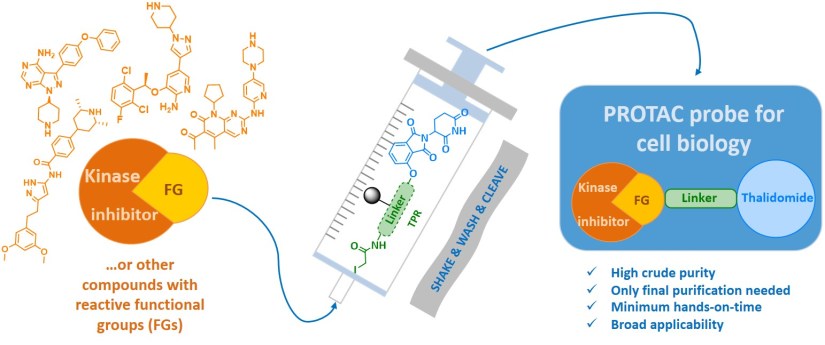 The approach of preloaded resins was also used in the field of proteolysis targeting chimeras (PROTACs). PROTAC conjugates consist of two main parts connected through a suitable linker, where one part interacts with the protein of interest, whereas the other binds to a component of E3 ubiquitin ligase. The phthalimide family is often employed as an E3 ligase binder to hijack cereblon to target proteins. Pharmacological targeting of protein kinases has been validated as an effective therapeutic strategy, and over 37 kinase inhibitor drugs have received approval for clinical use in certain cancers. However, specific resistance often reduces the sensitivity of targeted kinases to drugs during therapy, and therefore novel molecules or approaches are intensively sought. Kinase degradation induced by PROTACs represents an interesting alternative not only for mechanistic studies or therapy but also for kinases with kinase-independent functions. In our contribution, we introduced a preloaded resin for high-throughput synthesis of PROTACs and degradation of different protein kinases (Chem. Commun. 2019, 55, 929).