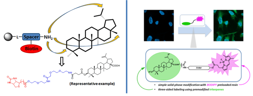 In this field, we have been focusing on the development of synthetic tools to enable the simple preparation of different bioconjugates for chemical biology. The general strategy applied preparation of preloaded resin and the use of the „shake-wash-cleave“ procedure. Our first reported preloaded resin yielded conjugates of semisynthetic triterpenes with cytotoxic activity but unknown mode of action. Their conjugation with widely used affinity tag biotin led to compounds applicable for biotin-streptavidin interaction assays (Bioconjug. Chem. 2015, 26, 2563). In the following years, we focused on visualization of small molecules in cells which becomes an essential tool in drug discovery. The most commonly used method is fluorescent microscopy, where a studied molecule is fluorescently labeled and directly visualized within the cell. A number of various conjugates of small molecules with fluorescent tags were reported to date with the application as probes, photosensitizers, or luminescence switches and sensors. We focused on the development and study of conjugates of cytotoxic triterpenes with BODIPY (Chem. Eur. J. 2018, 24, 4957).