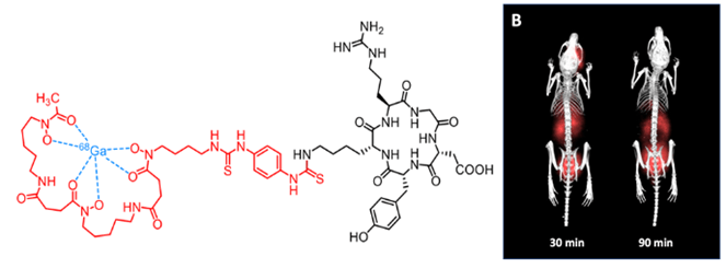 Our research also focused on the synthesis of conjugates applicable for molecular imaging using positron emission tomography (PET). Our initial study aimed to synthesize deferoxamine-based c(RGD) peptide conjugate for radiolabelling with gallium-68 and perform its basic preclinical characterization including testing of its tumor-imaging potential. We have shown here that [68Ga]Ga-DFO-c(RGDyK) can be used for αvβ3 integrin targeting, allowing imaging of tumor-induced angiogenesis by positron emission tomography (Int. J. Mol. Sci. 2021, 22, 7391).