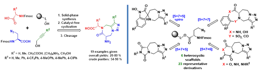 Recently, we replaced serine and threonine with azidoalanine. Immobilized amino acids were nosylated and alkylated with alkynols using Mitsunobu reaction conditions. After denosylation, acylation with Fmoc-azidoalanine yielded linear precursors that were thermally cyclized on resin to give immobilized triazolodiazepinones (Adv. Synth. Catal. 2021, 363, 1112). Moreover, the synthetic approach was applied to convenient solid-phase synthesis of oligopeptide containing a triazolodiazepinone moiety as the peptidomimetic heterocyclic constraint. Alteration of azidoalanine to homoazidoalanine led to diversity-oriented synthesis of tricyclic scaffolds bearing triazoles (J. Org. Chem. 2021, 86, 7963). When alkynols were combined with immobilized vinylalanine, suitable intermediates for ring-closure enyne metathesis were obtained and the resulting dienes were subjected to a Diels-Alder reaction. The method represents a simple tool for the parallel synthesis of complex, polycyclic isoquinolines (J. Org. Chem. 2022, 87, 5242).