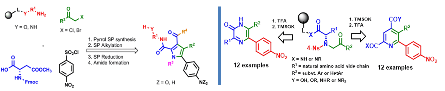 Combining these two concepts, we have started diversity-oriented solid-phase synthesis (DOSPS) from side-chain functionalized, natural, or non-natural amino acids immobilized via C-terminus to the polymer-supported resin. Those are subsequently converted to linear intermediates bearing three functional groups suitable for cycloaddition or cyclocondensation which could lead to diverse heterocyclic scaffolds. Our initial efforts were devoted to immobilized serine or threonine. After sulfonylation of the amino group with nitrobenzene sulfonyl chlorides followed by alkylation with bromoketones, the key intermediates reacted with various electrophiles, yielding a set of different scaffolds. More than 200 representative compounds were prepared with the use of applicable building blocks.