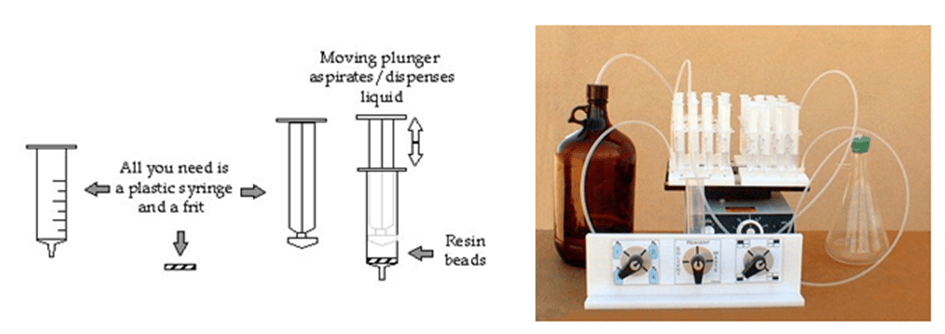 One part of our group is dealing with diversity-oriented synthesis (DOS) on polymer-supported resin. DOS aims to generate structurally diverse and stereochemically complex molecules starting from simple, commercially available building blocks. Using this methodology, many structurally distinct compounds can be produced in a relatively short period of time. In combination with solid-phase synthesis, it opens up new opportunities to find compounds with novel binding modes and therapeutic effects. Solid-phase synthesis has been frequently used in the search for biologically active compounds and their modification thanks to several significant advantages. The most important one could be considered a simple implementation of parallel synthesis in polypropylene fritted syringes, where no purification of synthetic intermediates is required, and thus huge compound collection libraries could be rapidly prepared and isolated.