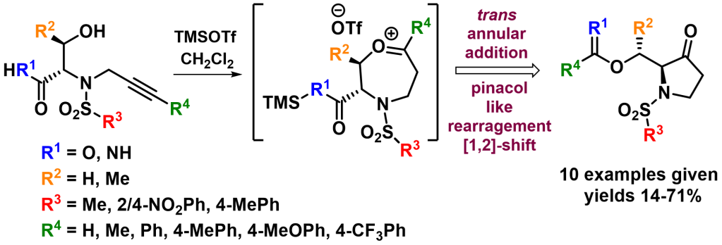 We also discovered a new pinacol-like rearrangement leading to chiral pyrrolidinones, when N-(3-phenylprop-2-yn-1-yl)-sulfonamides derived from serine and threonine were subjected to a reaction with trimethylsilyl trifluoro-methanesulfonate (TMSOTf). In contrast to a previously reported formation of 1,4-oxazepanes, this reaction afforded pyrrolidin-3-ones. A mechanistic explanation for this unexpected outcome was proposed, and the scope and limitations of the rearrangement were outlined (J. Org. Chem. 2020, 85, 985).