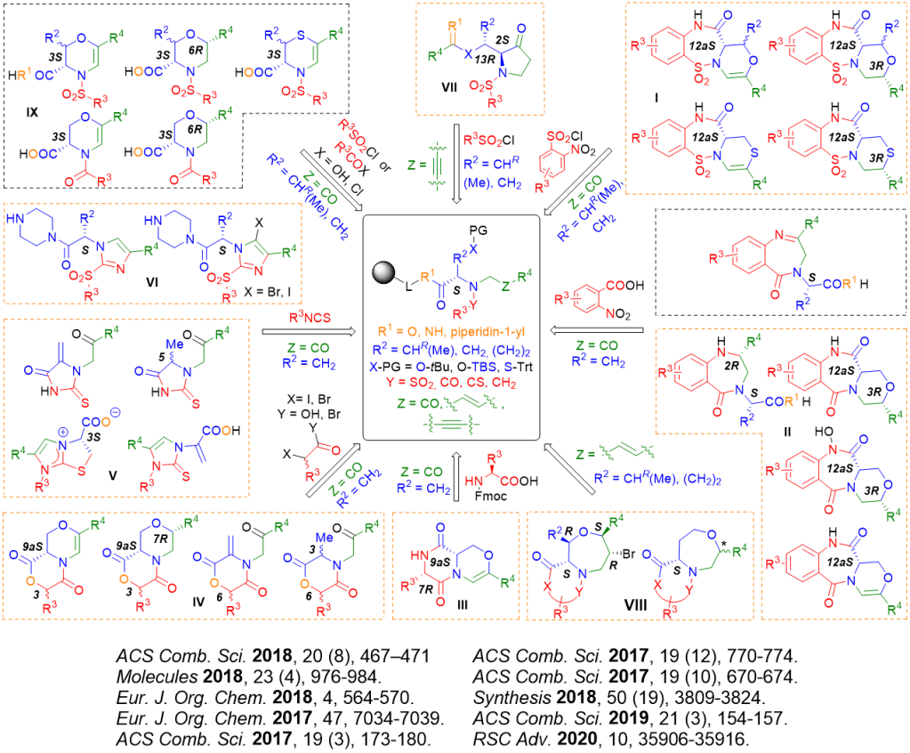 In our synthetic pathways, the starting material was typically the natural or non-natural amino acid immobilized via its C-terminus to Wang resin. As shown below, the starting amino acid was converted in a multistep sequence to different heterocyclic scaffolds. Our current projects were devoted particularly to use of C-immobilized serine or threonine for diversity oriented, reagent-based synthesis of hetereocycles bearing oxazine/morpholine scaffolds. After sulfonylation of amino group with nitrobenzensulfonylchlorides and alkylation with bromoketones, the key intermediates were subjected to modification using different reagents, which yielded the number of diverse heterocycles. Importantly, addition of triethylsilane in the cleavage cocktail (to liberate the target compounds from the resin) enabled to generate new stereocenter with the controlled configuration.