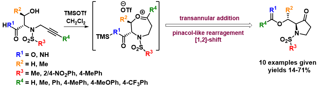 As a part of the above mentioned project, we discovered a new pinacol-like rearrangement leading to chiral pyrrolidinones (J. Org. Chem. 2020, 85 (2), 985-993). N-(3-phenylprop-2-yn-1-yl)-sulfonamides derived from serine and threonine were synthesized using solid-phase synthesis and subjected to reaction with trimethylsilyl trifluoro-methanesulfonate (TMSOTf). In contrast to the previously reported formation of 1,4-oxazepanes, this reaction afforded pyrrolidin-3-ones. A mechanistic explanation for this unexpected outcome was proposed, and the limitations and scope of the rearrangement were outlined.