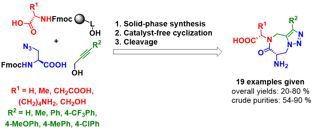 Recenty, we replaced serine and threonine with Fmoc-azidoalanine as the key building block to synthesize triazolo[1,5-a][1,4]diazepin-6-ones on solid support (Adv. Synth. Catal., 2020, in press). Amino acids immobilized on Wang resin were nosylated and alkylated with propargyl alcohol, but-2-yn-1-ol or different 3-phenylprop-2-yn-1-ols using Mitsunobu alkylation conditions. After denosylation, acylation with Fmoc-azidoalanine yielded linear precursors that were thermally cyclized on resin to give immobilized triazolodiazepinones. After cleavage from the polymer support, the target compounds were obtained in high crude purities and good overall yields. Furthermore, the synthetic approach was applied to convenient solid-phase synthesis of oligopeptide containing the triazolodiazepinone moiety as the peptidomimetic heterocyclic constraint.